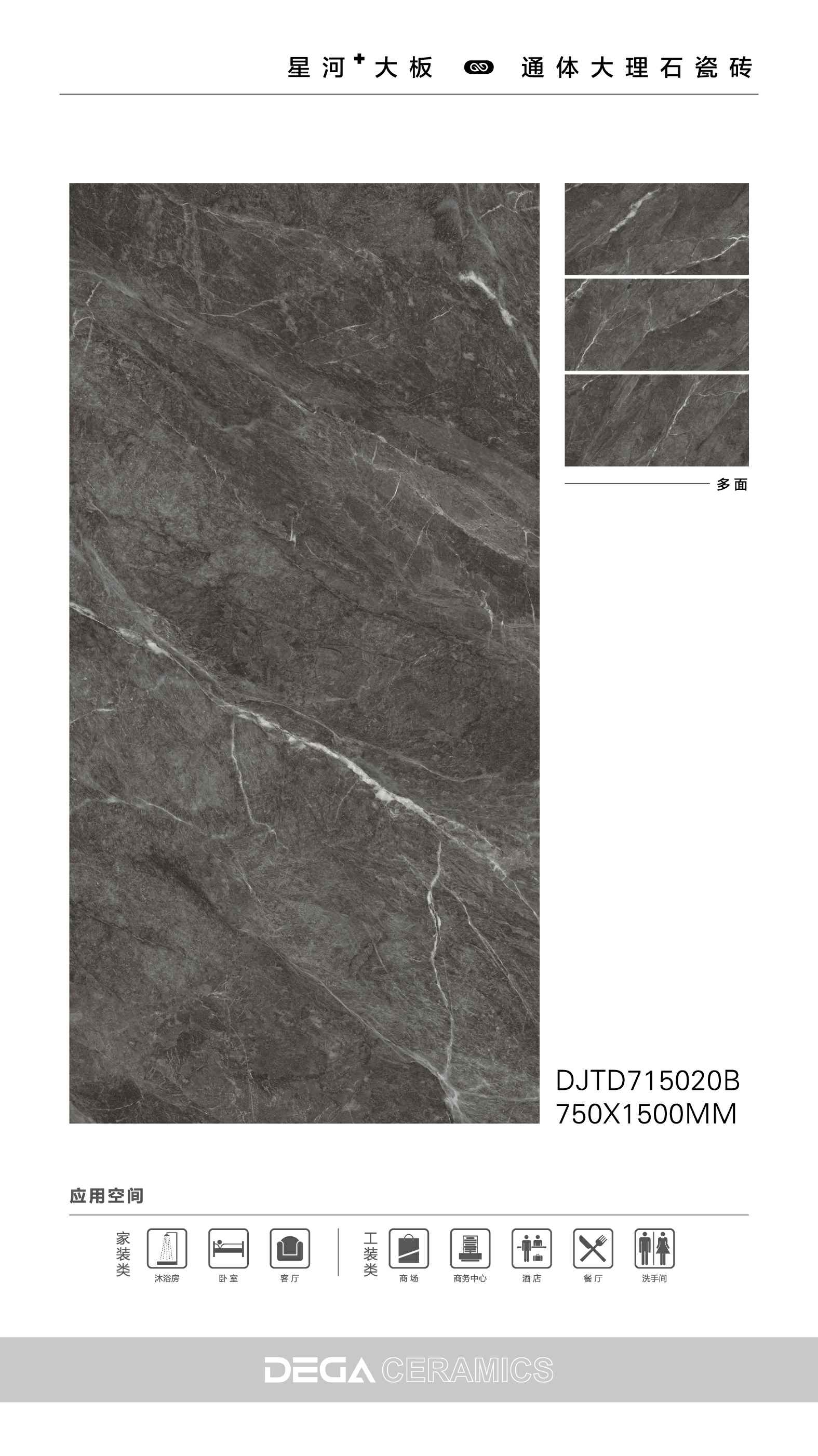 从规格形式的选择、纹理的趣味,到丰富内涵的表现、文化的传承等…… 都是她的每一侧面,在750X1500MM创造的舞台中央,是属于一片瓷砖传奇剧的演出。